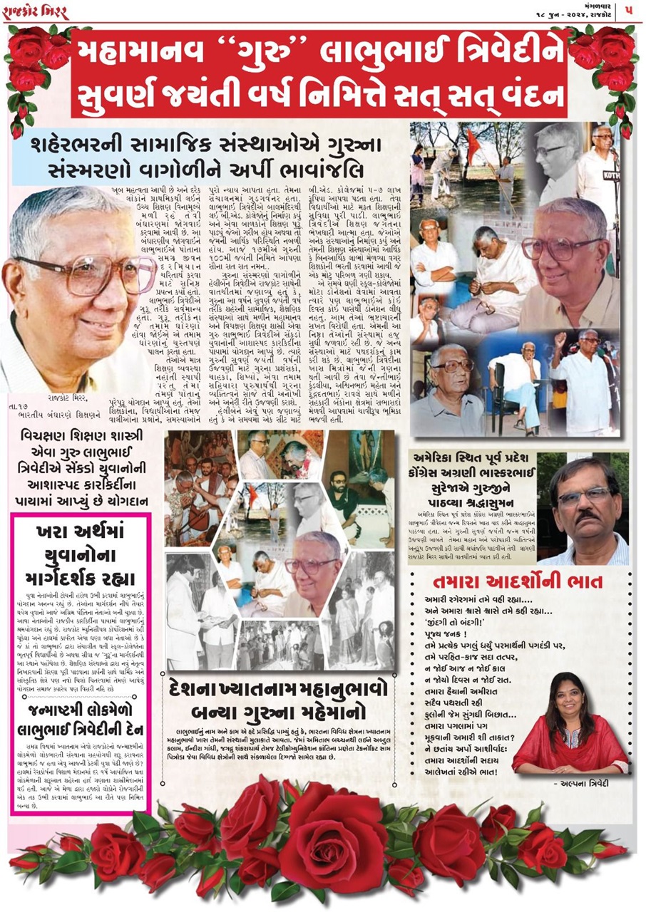 Education was his forte. He presided over the destiny of hundreds of students. He was the founder of many social, educational, and cultural institutions in Saurashtra and managed them very efficiently and successfully. He contributed significantly to the development of Gujarat and Saurashtra universities. He was appointed as the Pro-Vice Chancellor of Saurashtra University for two terms. He was a real benefactor, patron, supporter, friend, philosopher, and guide of the academic world.